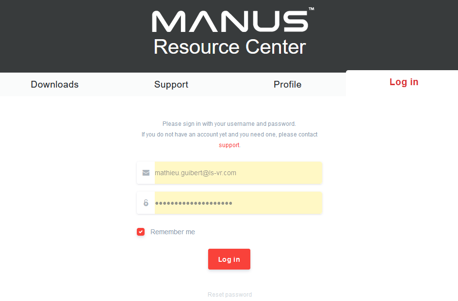Se rendre sur le site du MANUS Resource Center à l'adresse https://resources.manus-vr.com/login.