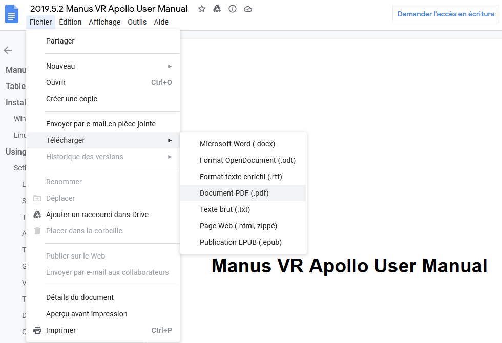 Dans la colonne Documentation, cliquer sur Read donne accès à la documentation en ligne Manus VR Apollo User Manual. Dans le menu Fichier, l'option Télécharger permet de récupérer le document dans le format souhaité.