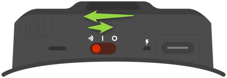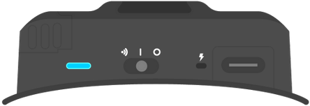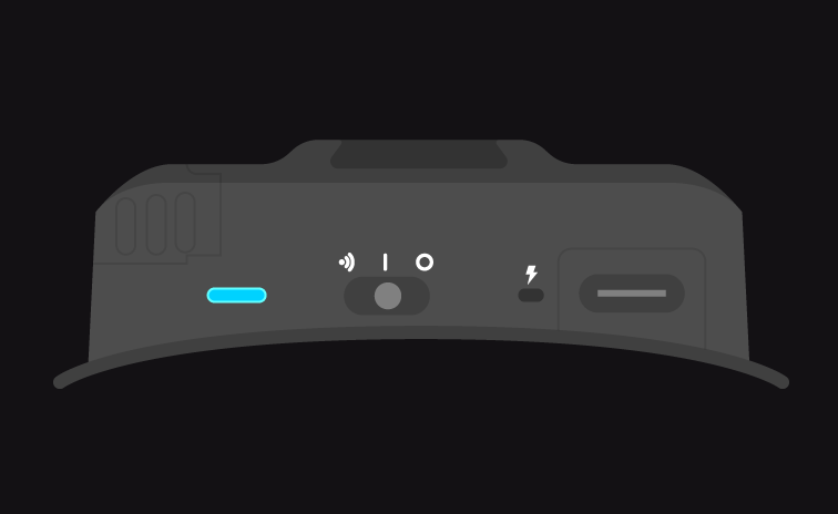 Chaque nouveau gant doit être détecté pour qu'il puisse être reconnu par le dongle. Pour détecter le gant, faites glisser l'interrupteur rouge vers la position émission (à gauche sur l'image ci-dessous). L'interrupteur revient automatiquement en position I. Pour des instructions illustrées, consultez la page Appairage du centre de connaissances Manus. Durant la détection le voyant clignote rapidement. Une fois connecté, le voyant est bleu fixe.