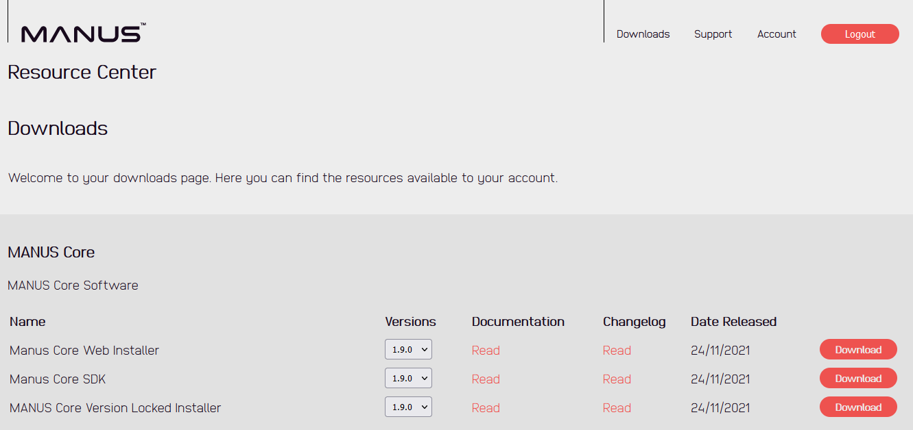 MANUS Core, cliquer sur le boutonDownloadà droite pour télécharger la dernière version de MANUS Core (Nota : La version 1.9.0 est recommandée au 2022-06-18. Ne pas installer une version supérieure sans accord de Light And Shadows). Vous pouvez indifféremment choisir la procédure en ligne ou hors ligne :- Choisir Manus Core Web Installer pour une installation "en ligne".