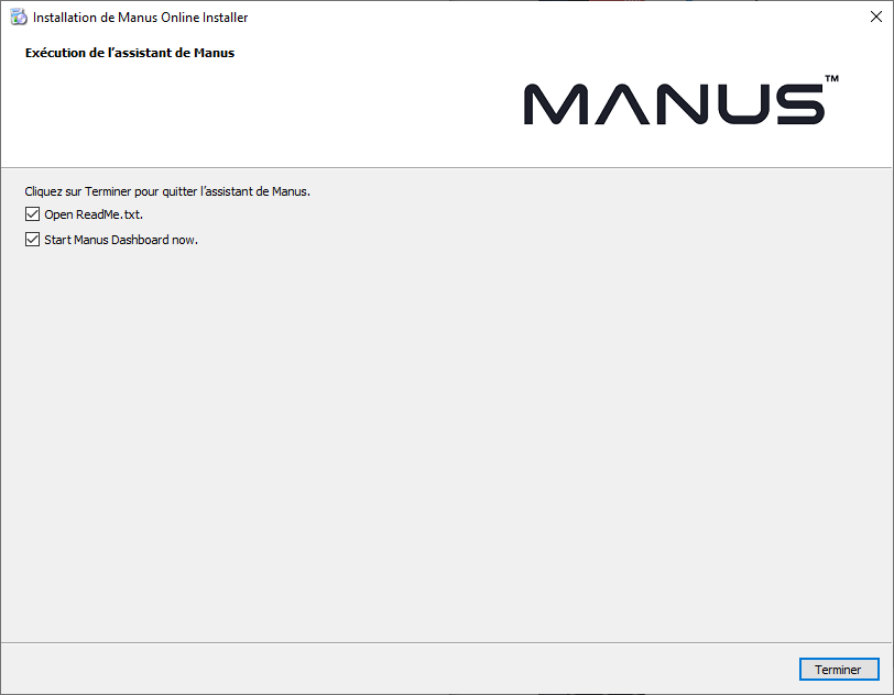 Dézipper le fichier que vous avez téléchargé pour extraire le fichier ManusInstallerOnline.exe (ou ManusInstallerOffline.exe) et double-cliquer pour lancer l'installation.