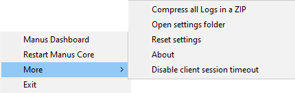 Vous pouvez quitter Manus Core à tout moment en choisissant Exit dans le menu contextuel de l'icône