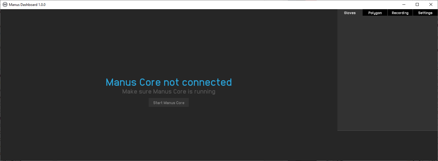 . Le flux de data est interrompu et les messages "Data stream interrupted" puis "Manus Core not connected" sont affichés dans le Manus Dashboard. Noter que si Manus Core est fermé par erreur, vous pouvez alors redémarrer Manus Core en cliquant sur le bouton Start Manus Core dans le dashboard : les gants sont redétectés immédiatement.
