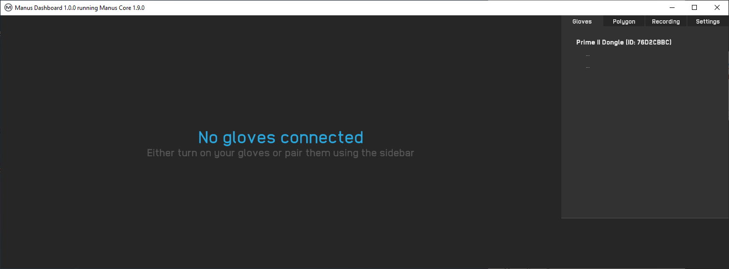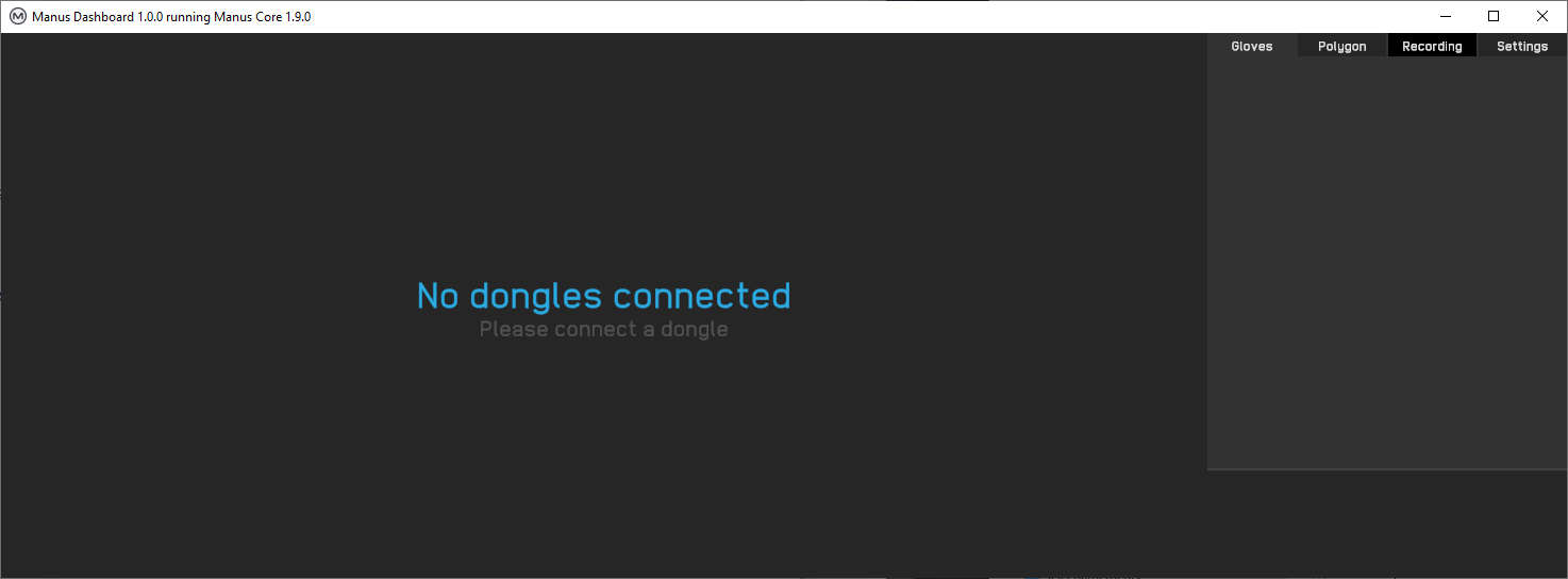 Si le dongle n'est pas branché, le Manus Dashboard affiche le panneau "No dongles connected". Brancher votre dongle.