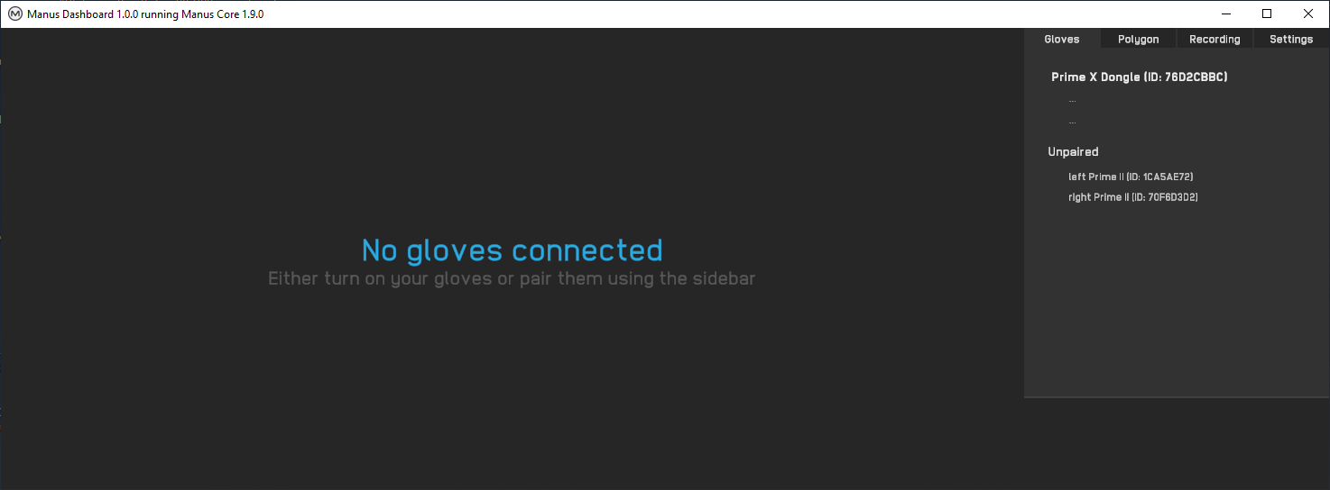 L'application Manus Dashboard est l'interface utilisateur du système MANUS. Vous pourrez y appairer les gants, procéder à leur calibration et modifier les réglages. La charge des batteries y est également indiquée. La société MANUS propose des systèmes "corps entier" qui ne concernent pas ErgoCapt. Seuls les gants nous intéressent ici et seul l'onglet Gloves sera utilisé (les onglets Polygon et Recording ne concernent pas ErgoCapt).