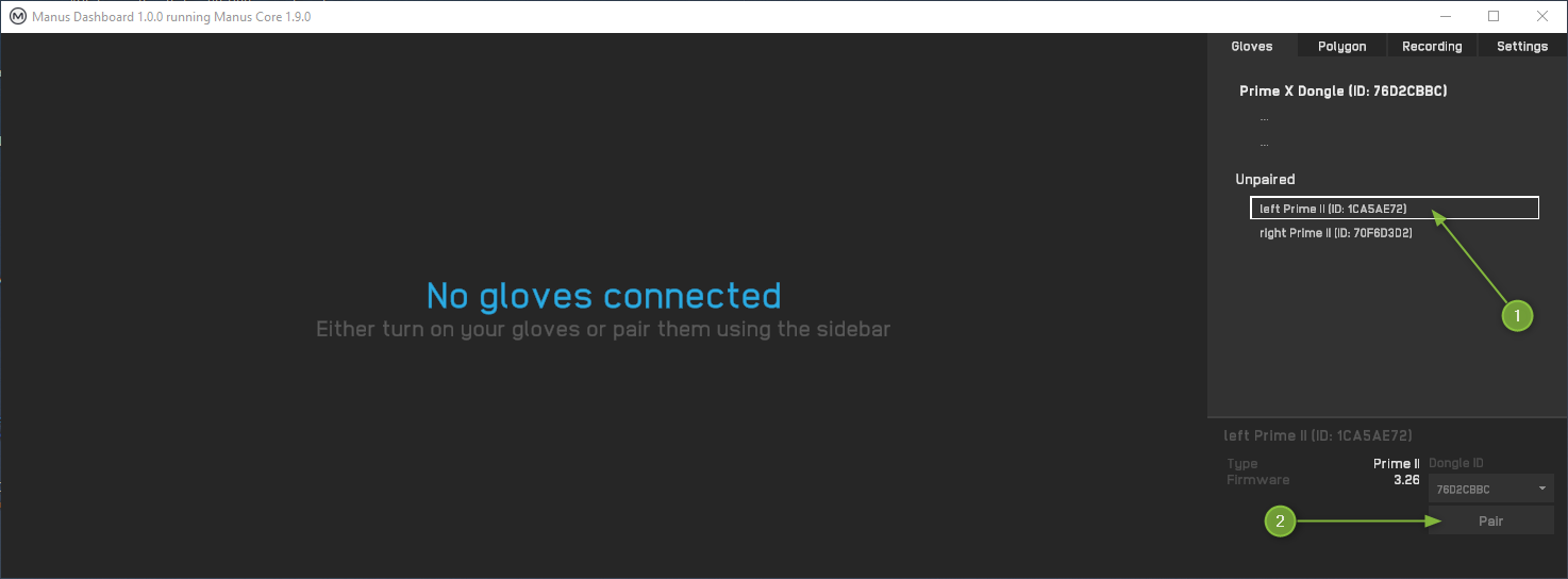 Si les gants sont détectés mais ne sont pas appairés, le Manus Dashboard affiche l'identification du gant (latéralité et ID) dans la rubrique "Unpaired" (onglet Gloves).