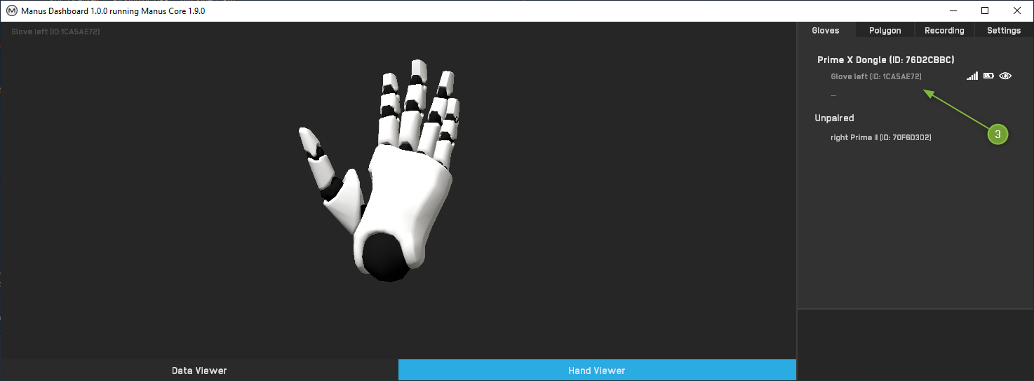 *). - Vérifier que les gants sont reconnus : leur numéro d'identification (ID) est affiché dans la partie droite du Dashboard.