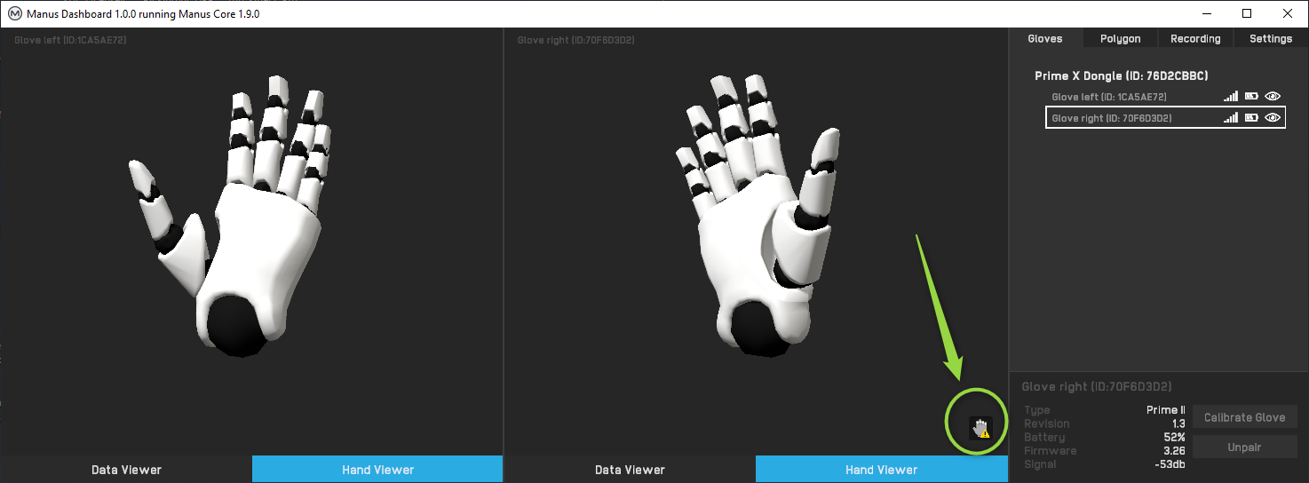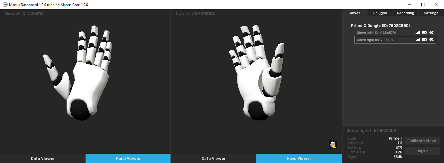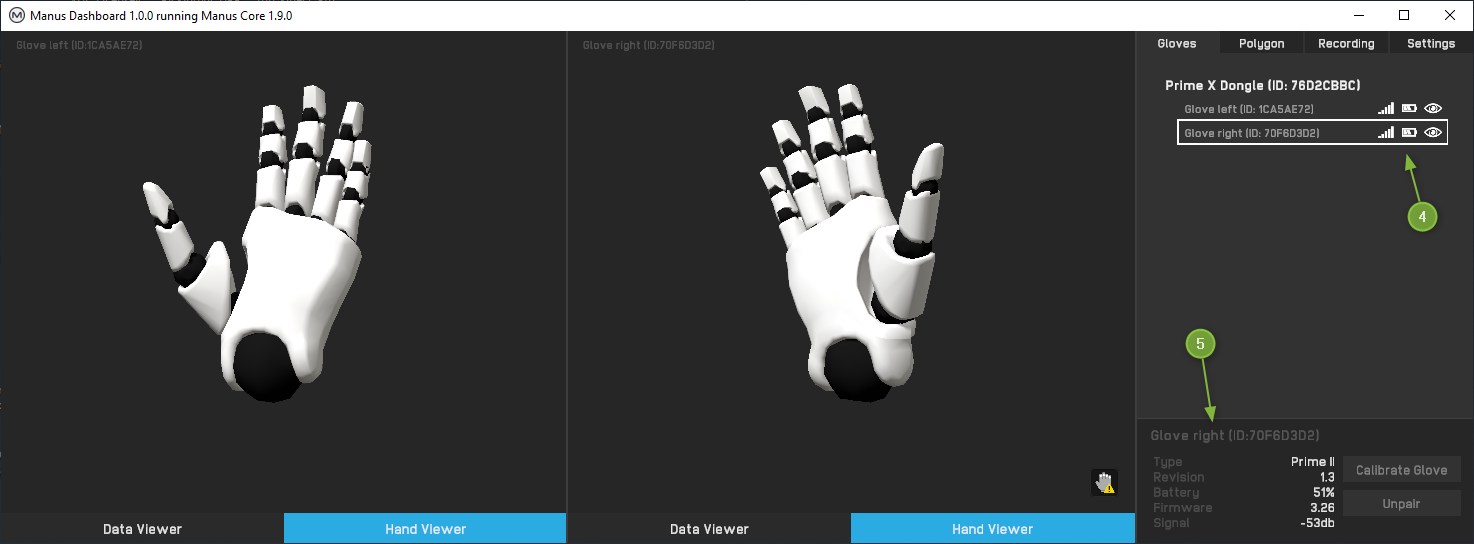 Lorsque les deux gants sont connectés, le Manus Dashboard affiche les informations de chaque gant dans la zone de droite du panneau (voir les points n°4 et n°5 sur l'image ci-dessus).