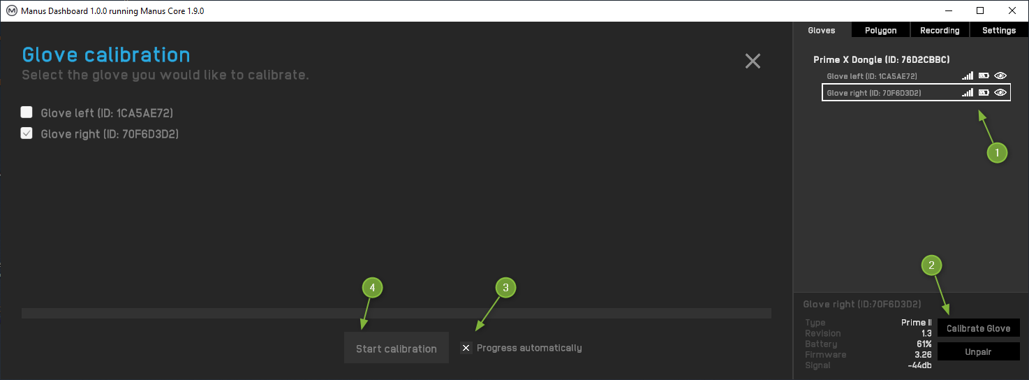 Sélectionner un premier gant (pastille n°1 ci-dessous) dans le Manus Dashboard puis cliquer sur Calibrate Glove (pastille n°2).