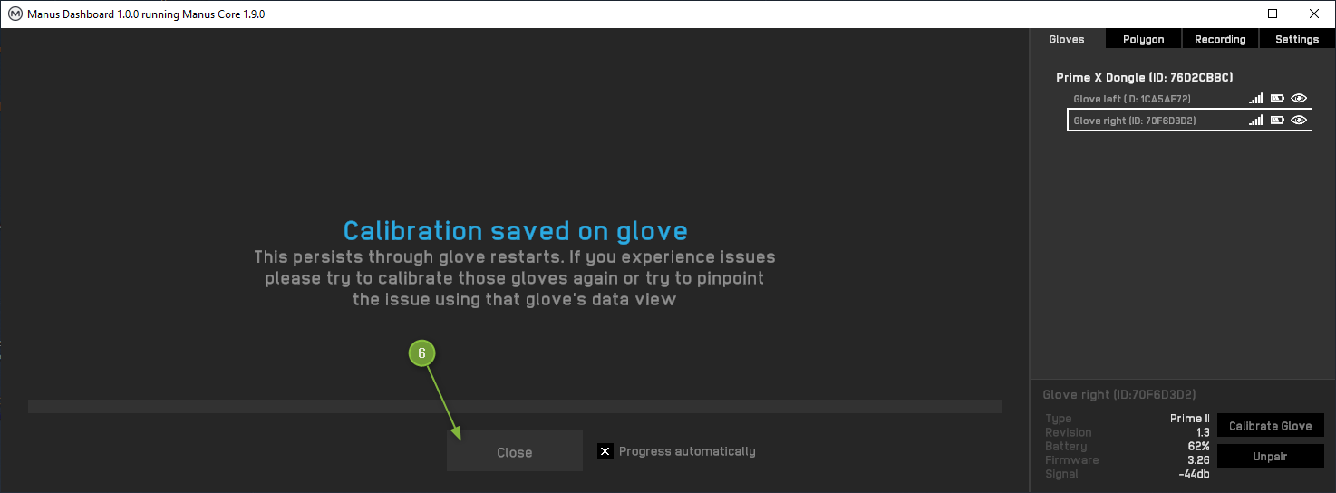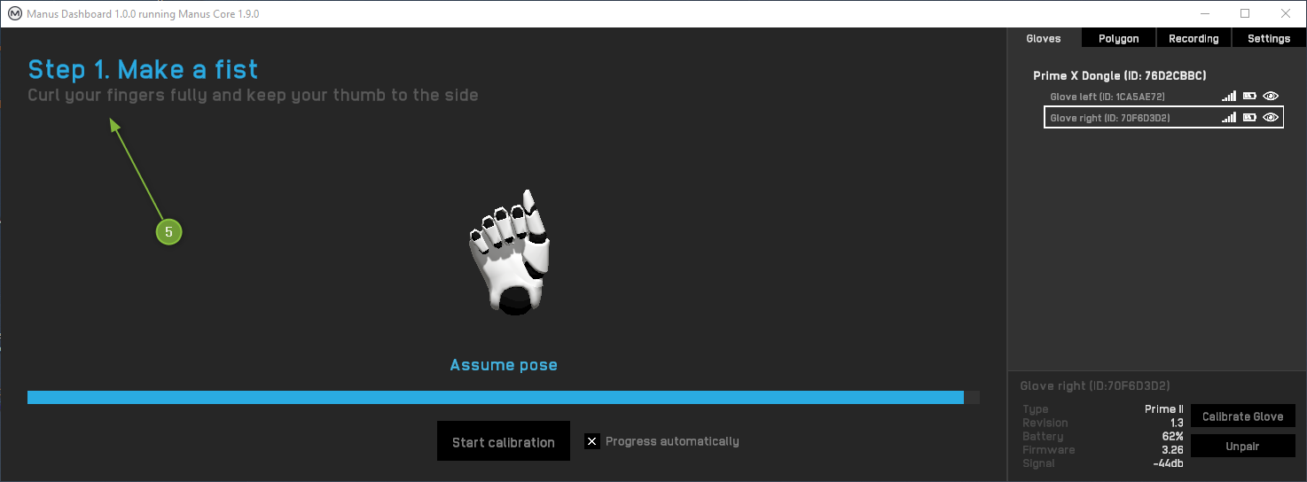 Trois étapes sont nécessaires (pastille n°5). Pour une illustration plus détaillée de ces étapes, consultez la page Calibration du centre de connaissances Manus.