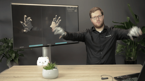 Pour calibrer les capteurs IMU, commencer par faire un mouvement répétitif comme si vous nagiez la brasse dans un mouvement symétrique de vos deux mains. Terminez en gardant les mains immobiles (si ça peut vous aider, posez vos mains sur la table). Pour des explications et voir une vidéo du mouvement, consultez la page Sensors IMU du centre de connaissances Manus ou cliquer sur