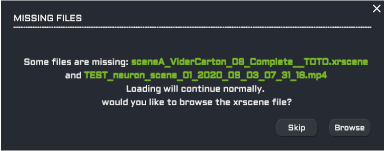 - Si le fichier scène a été utilisé mais qu'il n'est pas trouvé dans le dossier référencé dans la séquence, un message d'alerte est affiché.
