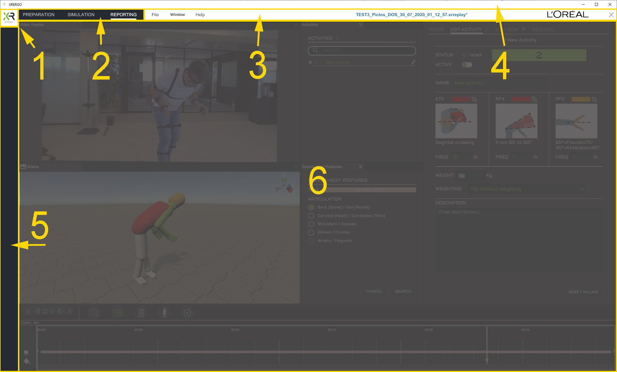 Dans l'atelier ANALYSIS, vous trouvez les éléments habituels de l'interface de ErgoCapt (numérotés de 1 à 5 dans l'image ci-dessous) et une zone de travail (6) divisée en plusieurs panneaux (numérotées de 7 à 14 dans l'image suivante).
