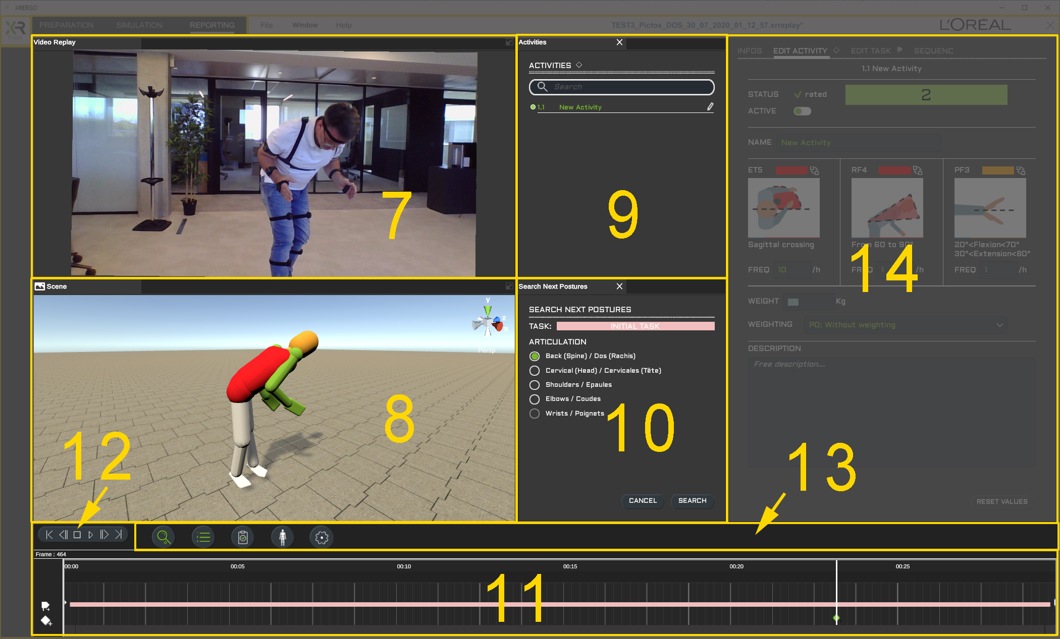 Dans l'espace de travail vous trouverez : (7) Le panneau Vidéo Display. (8) Le panneau Scène. (9) Le panneau Activities. (10) Le panneau Search Next Postures. (11) La ligne temporelle. (12) Le panneau navigation dans la timeline. (13) Le panneau de la barre des boutons. (14) Le panneau latéral avec ses 4 onglets : (14-1) Le panneau Info. (14-2) Le panneau Activity. (14-3) Le panneau Edit Task. (14-4) Le panneau Sequence. Visible sur demande, le panneau Replace Posture.