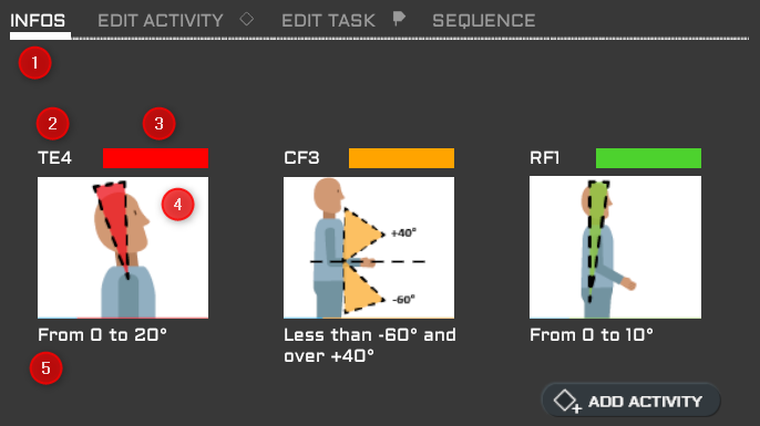 Le panneau Info est affiché lorsque la tête de lecture est sur une frame vide, c'est à dire sans activité. Les trois pictos affichés sont ceux retenus par Ergoéval pour la posture courante. Le bouton Add Activity