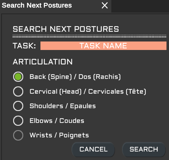 Le panneau REPLACE POSTURE permet de choisir un pictogramme spécial pour qu'il se substitue à l'un des 3 pictogrammes d'une Activity. Les pictogrammes concernés sont des codes postures liés aux doigts (D), genoux (G), mains (M), poignets (P), épaule (E) et coude (C) qui ne peuvent pas être détectés automatiquement lors de la capture de mouvement. Lors de l'édition d'une Activity, si l'utilisateur ergonome juge que l'un de ces codes postures est plus important que l'un de ceux présents dans l'Activity, il peut procéder à son remplacement.
