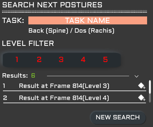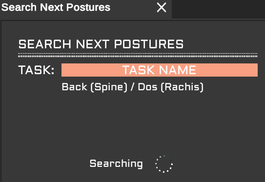 La recherche de postures s'effectue à partir de ce panneau. Déplacer le curseur temporel dans une tâche, sélectionner une articulation et lancer la recherche. Un anneau d'attente est affiché le temps de parcourir la partie de l'enregistrement concerné par la tâche courante. Les résultats sont affichés. Cliquer sur un résultat pour le sélectionner. Cliquer sur