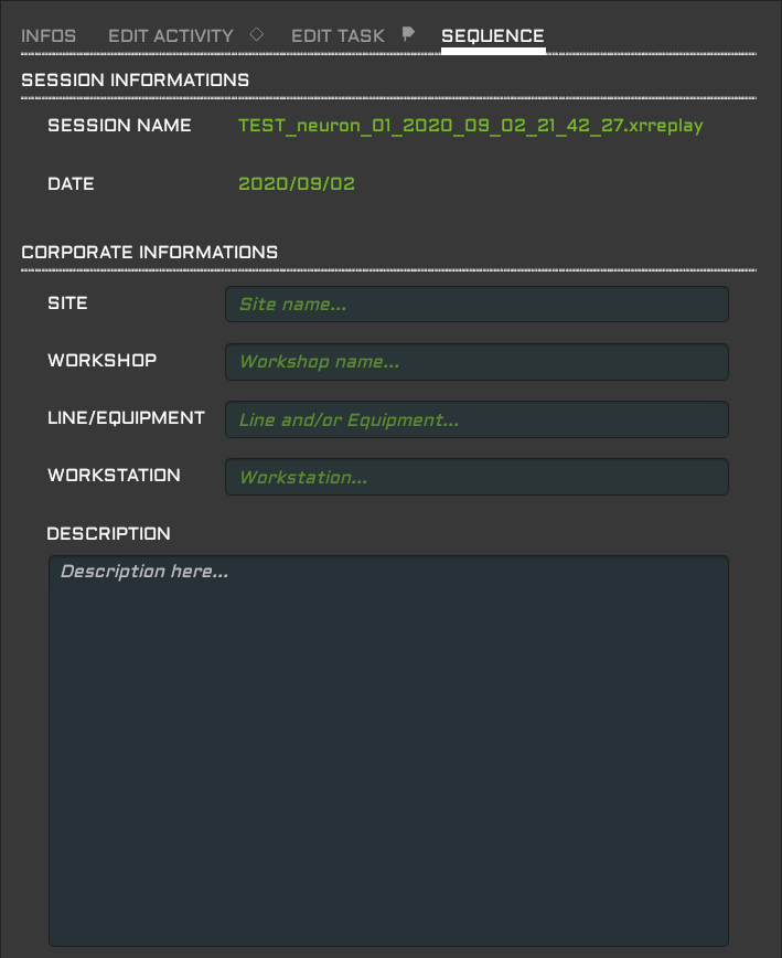 Le panneau latéral situé à extrême droite de la fenêtre de travail affiche alternativement les informations courantes (Info), les paramètres des activités (Edit Activity), les paramètres des tâches (Edit Task) et les métadonnées de la séquence (Sequence) en fonction du contexte et des demandes de l'utilisateur. Ces 4 panneaux sont présentés ci-dessous.