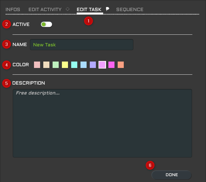 - ACTIVE/INACTIVE : La tâche est active par défaut. Lorsque l'utilisateur bascule le bouton sur Inactive (la couleur du bouton bascule est rouge), toutes les activités concernées par la plage temporelle de la tâche sont rendues inactives et ne sont plus prises en compte dans la synthèse finale.