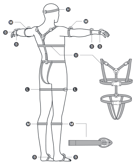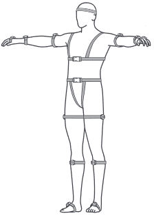 Placer les straps sur les bras et les jambes, en respectant les longueurs. Se référer aux images ci-dessous. Noter que paume vers le bas, les capteurs des bras sont vers le haut, les capteurs des pieds sont vers le haut, ceux de la jambe vers l'avant (il est possible de les orienter vers le côté extérieur si vous devez vous agenouiller), ceux des cuisses sur l'extérieur.