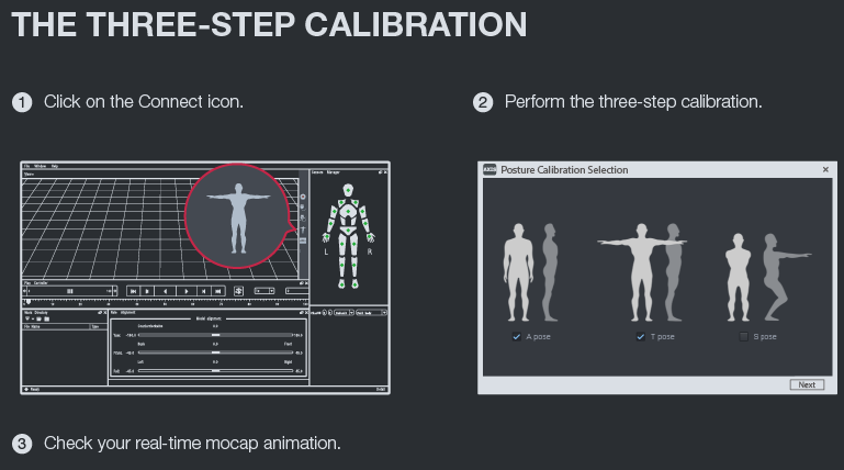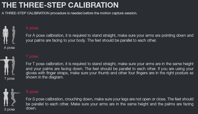 La calibration consiste à l'initialiser l'orientation des capteurs les uns par rapport aux autres ainsi que leur position sur le corps du sujet pour avoir une capture de mouvements cohérente et en adéquation avec la posture de l'opérateur.