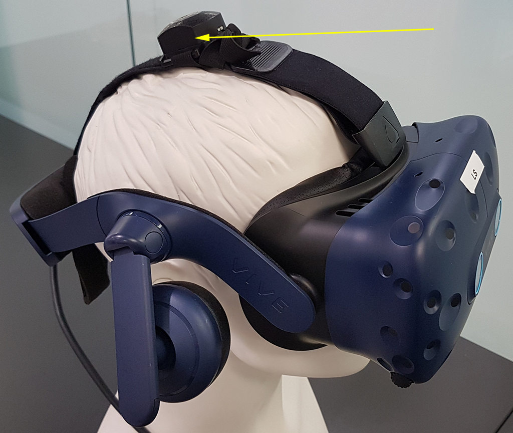 - Pour une capture en VR-Neuron, placer le capteur sur le support fixé à sangle du casque HTC de manière à ce que le capteur soit placé au sommet du crâne, comme sur la photo suivante.