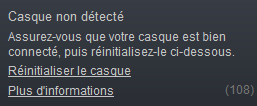 Si le casque n'est pas correctement branché ou que le boîtier de liaison n'est pas allumé, le casque n'est pas détecté et un message d'erreur explicite est affiché : vérifier les liaisons ou allumer le boîtier de liaison et cliquer sur "Réinitialiser le casque". SteamVR va redémarrer.