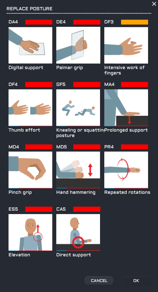 Le panneau REPLACE POSTURE permet de choisir un pictogramme pour qu'il se substitue à l'un des 3 pictogrammes par défaut d'une Activité. Les pictogrammes concernés sont des codes postures liés aux doigts (D), genoux (G), mains (M), poignets (P), épaule (E) et coude (C) qui ne peuvent pas être détectés automatiquement lors de la capture de mouvement. Lors de l'édition d'une Activité, si l'utilisateur ergonome juge que l'un de ces codes postures est plus important que l'un de ceux présents dans l'Activité, il peut procéder à son remplacement.